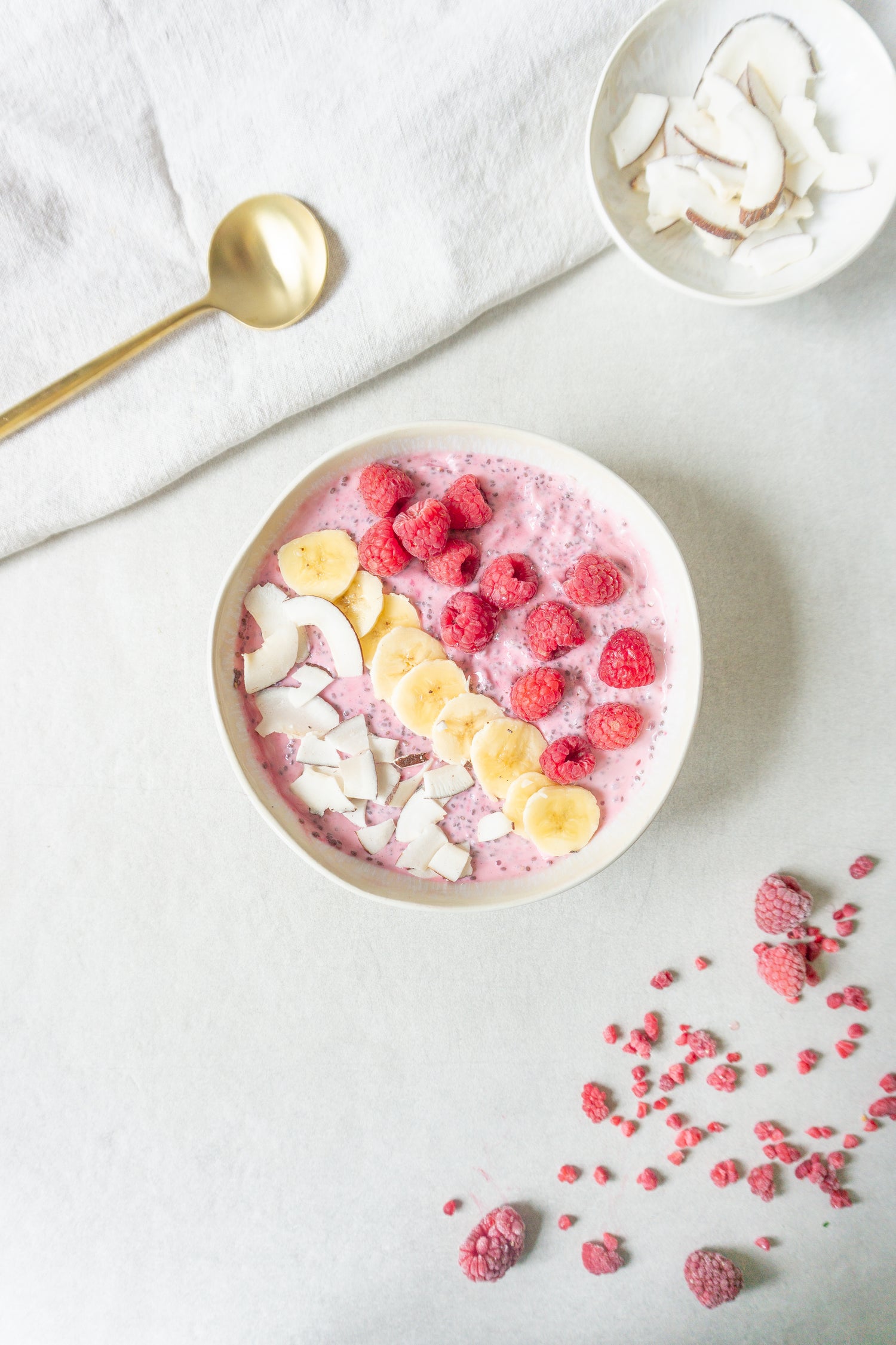 Zutaten: 150 g TK Himbeeren• 100 ml Milch• 1 EL Honig• 30 g Chiasamen• 150 g Joghurt• Kokosflocken •frische Himbeeren •Banane
